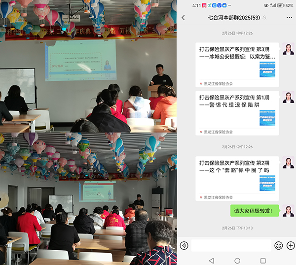 在此次打擊“代理退?!毙麄骰顒又?,七臺河中支利用微信工作群、微信朋友圈轉(zhuǎn)發(fā)宣傳內(nèi)容,詳細(xì)剖析了黑灰產(chǎn)的常見運(yùn)作模式,非法“代理退保”可能給消費(fèi)者帶來的四方面風(fēng)險(xiǎn):一是資金受損風(fēng)險(xiǎn);二是喪失正常保險(xiǎn)保障的風(fēng)險(xiǎn);三是個(gè)人信息泄漏風(fēng)險(xiǎn);四是相關(guān)行為可能導(dǎo)致消費(fèi)者面臨訴訟等法律風(fēng)險(xiǎn)。號召廣大群眾增強(qiáng)風(fēng)險(xiǎn)防范意識,警惕非法“代理退?!碧茁?。