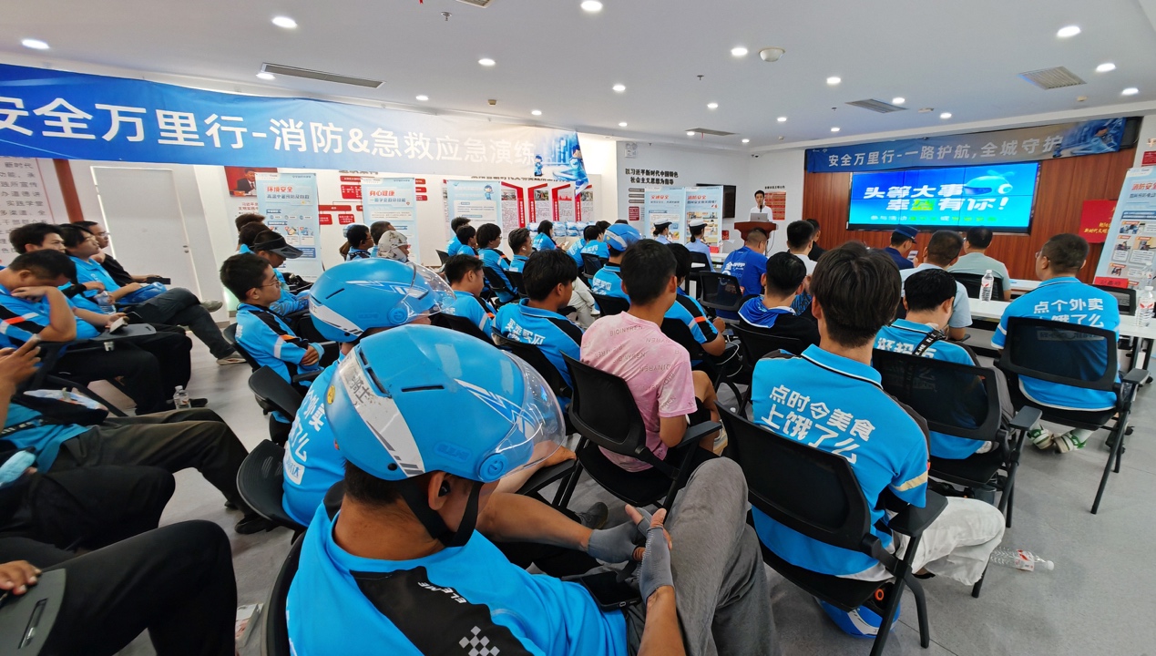 騎手既是安全出行的參與者,也是城市生活的守護者。當天,北京市公安局公安交通管理局朝陽交通支隊、北京市朝陽區(qū)消防救援支隊舉行了安全知識講座,餓了么還為騎手進行了應急救援培訓。