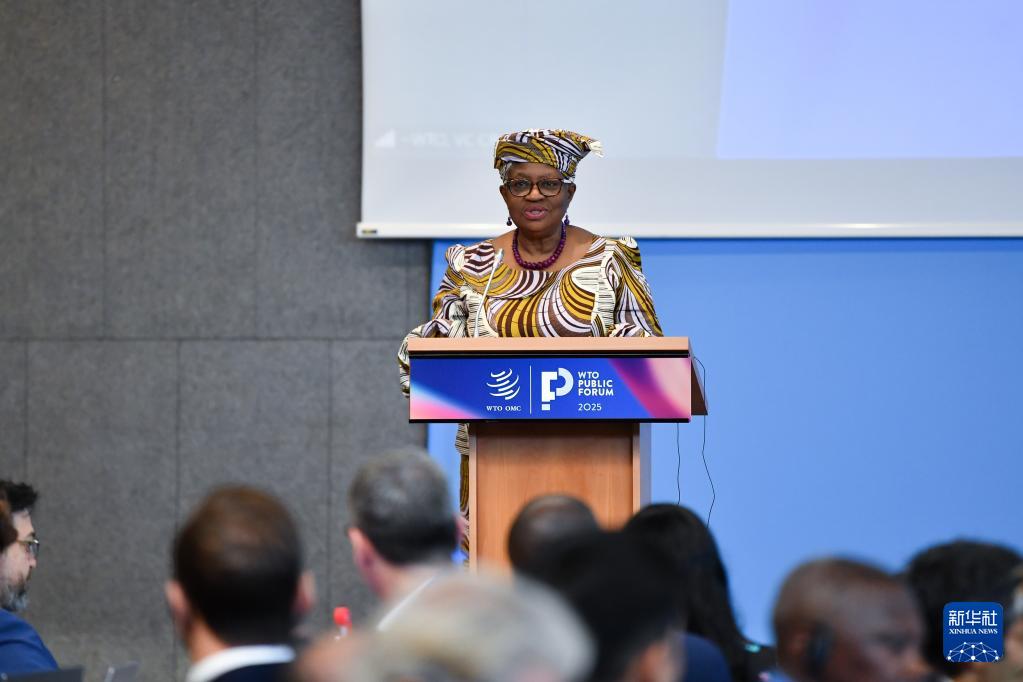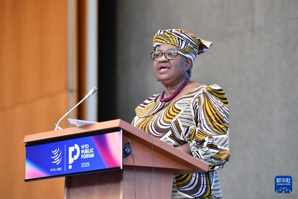 9月17日,在瑞士日內瓦世貿組織總部,世貿組織總干事伊維拉在《2025世界貿易報告》發(fā)布會上講話。新華社記者 連漪 攝