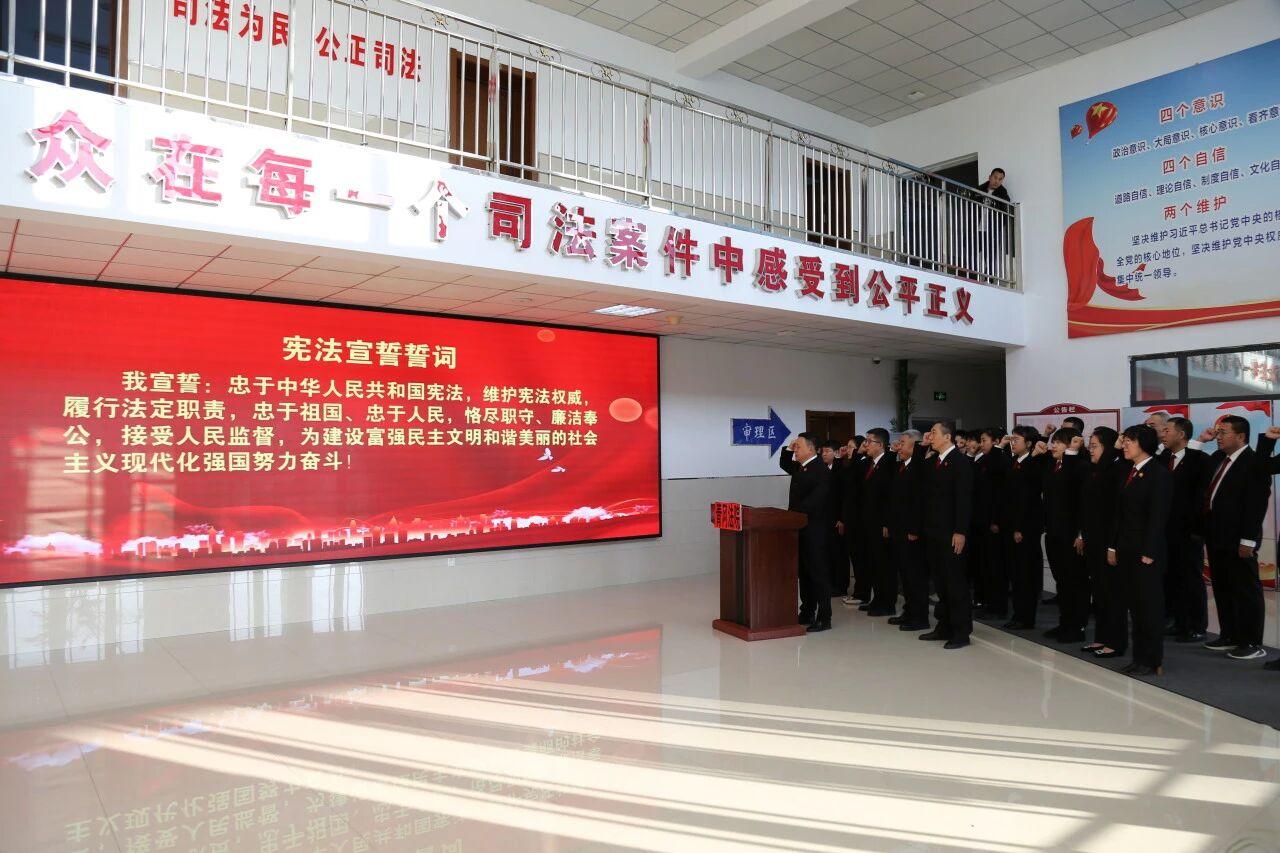 孫長久院長左手撫按憲法,舉起右拳,高聲領(lǐng)誓,各位干警莊嚴(yán)宣誓——“我宣誓:忠于中華人民共和國憲法,維護(hù)憲法權(quán)威,履行法定職責(zé),忠于祖國、忠于人民,恪盡職守、廉潔奉公,接受人民監(jiān)督,為建設(shè)富強(qiáng)民主文明和諧美麗的社會(huì)主義現(xiàn)代化強(qiáng)國努力奮斗!”
