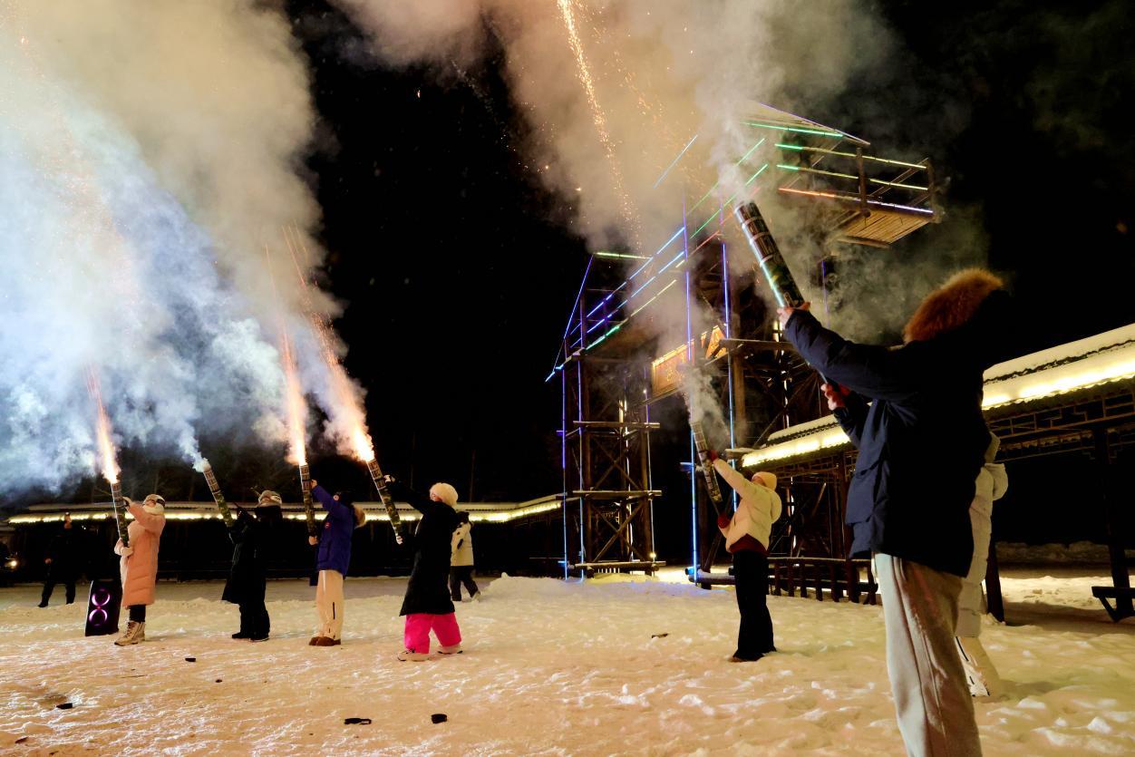 南方游客在龍河驛站燃放煙花,璀璨煙花照亮夜空(王力 攝)