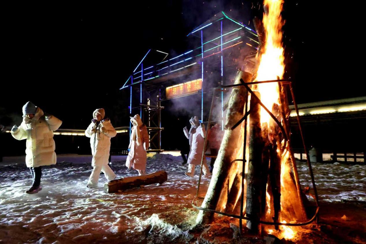 為讓游客盡情解鎖冰雪玩法,阿木爾林業(yè)局在龍河驛站專門設(shè)置篝火區(qū),當(dāng)熊熊篝火燃起,大家圍著篝火載歌載舞,盡情沉醉在冰雪帶來的野趣與浪漫之中?!斑@潔白無瑕、晶瑩剔透的冰雪,是我們南方人從未見過的美景,太有吸引力了!”來自河南焦作的游客劉永甜興奮地說。龍河驛站還精心推出地道東北風(fēng)味餐飲,排骨燉豆角、烤全羊等特色佳肴分量十足、香氣撲鼻,讓每一位游客大快朵頤、口齒留香。