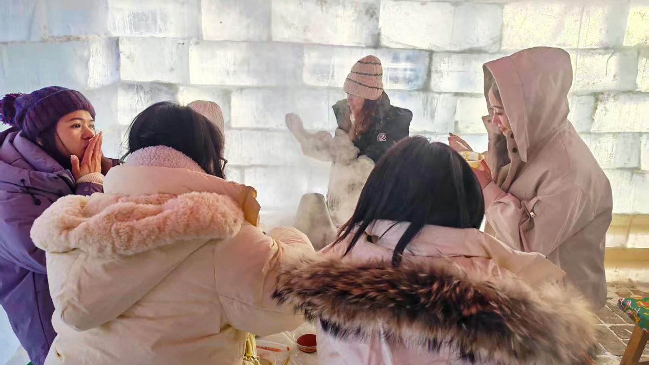 最受游客追捧的冰屋火鍋體驗,今年在味覺與感官雙重享受上再升級。冰屋內(nèi)溫度保持在零下30℃左右,卻絲毫不影響食客們的熱情,80個餐位時常座無虛席。林場精選大興安嶺本地鮮切羊肉、林下鮮蔬等特色食材,搭配地道東北銅鍋炭火,讓游客在極寒環(huán)境中品味熱辣鮮香,“冰火兩重天”的極致體驗直擊味蕾與身心。