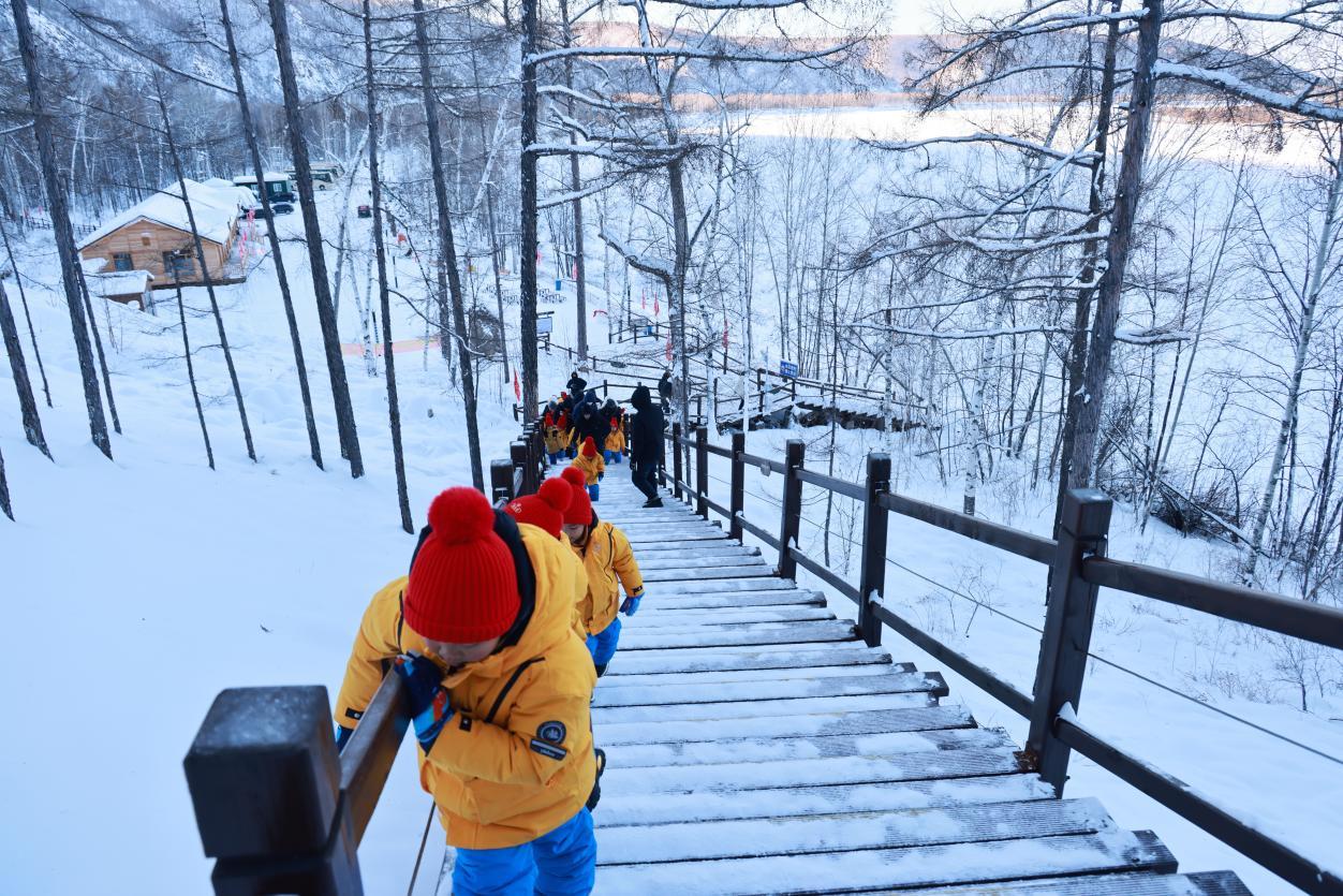 孩子們排成一串靈動的小隊(duì),踩著積雪在棧道上噠噠前行,腳下“咯吱咯吱”的清脆聲響,為這場研學(xué)之旅奏響歡快序曲。軟糯的廣西口音此起彼伏,孩子們或好奇地觸摸棧道積雪,冰涼的觸感讓他們瞇起眼睛直跺腳;或緊緊抓著欄桿,任憑小臉凍得通紅,仍目不轉(zhuǎn)睛眺望遠(yuǎn)方“Ω”形的冰封江灣,沉浸式感受北國冰雪的奇妙。那一抹抹跳動的橘色,在純白世界中宛如一團(tuán)團(tuán)小火苗,格外耀眼。