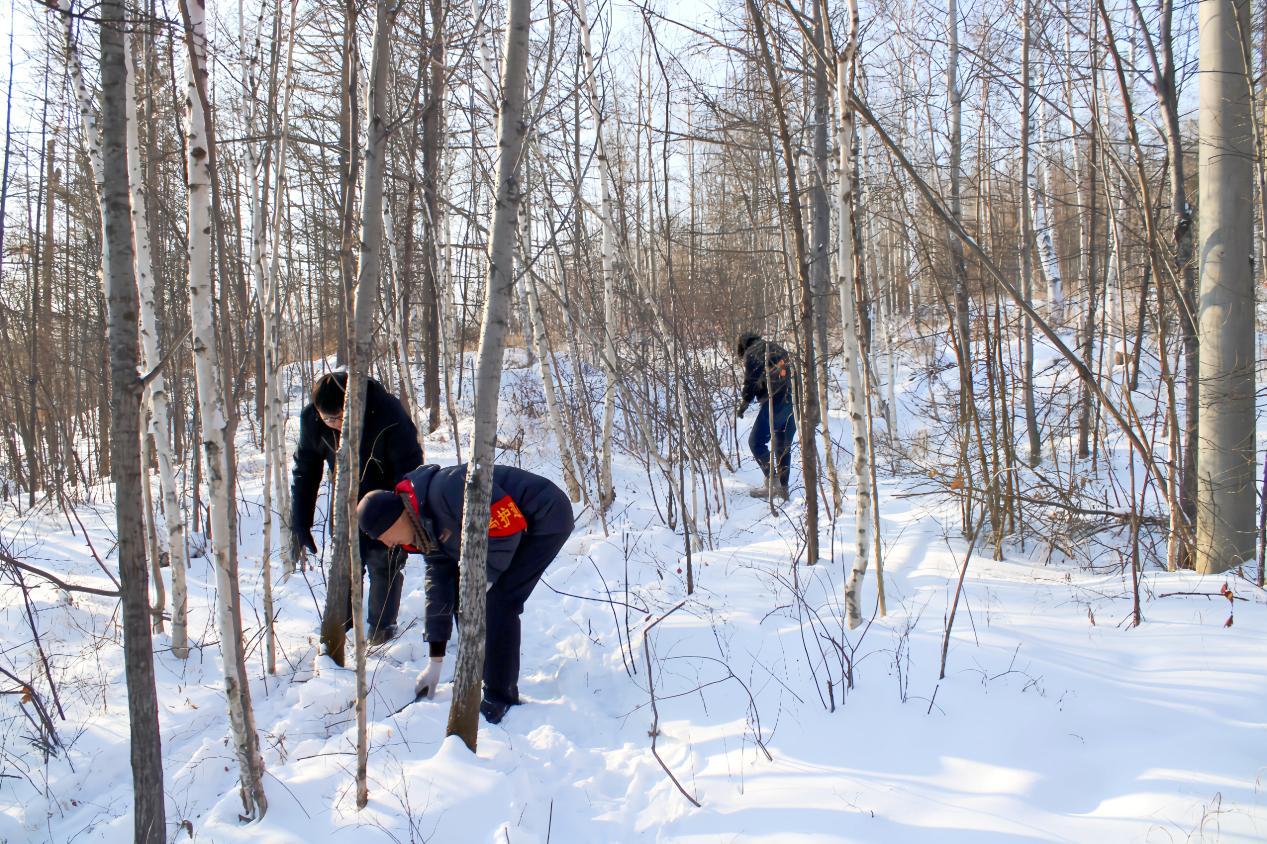 林場(chǎng)工作人員正在仔細(xì)排查可能隱藏在草叢、樹(shù)下、石縫中的獵夾、獵套(趙可心 攝)