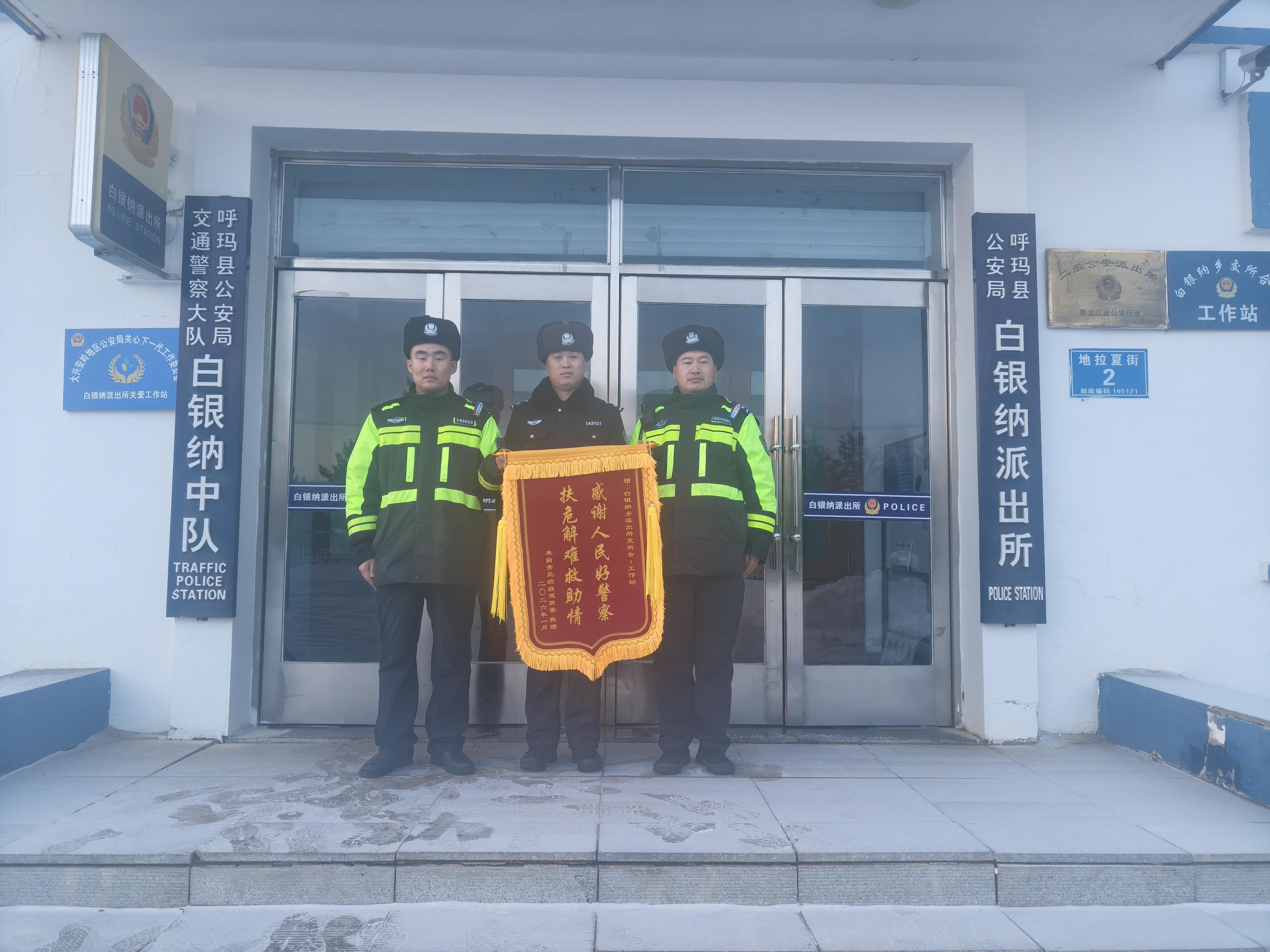 雖已時隔多日,游客仍銘記著那個寒夜里感受到的警察溫度和擔當,特意定制錦旗,跨越千里寄送至呼瑪縣公安局白銀納派出所,以表深深謝意。