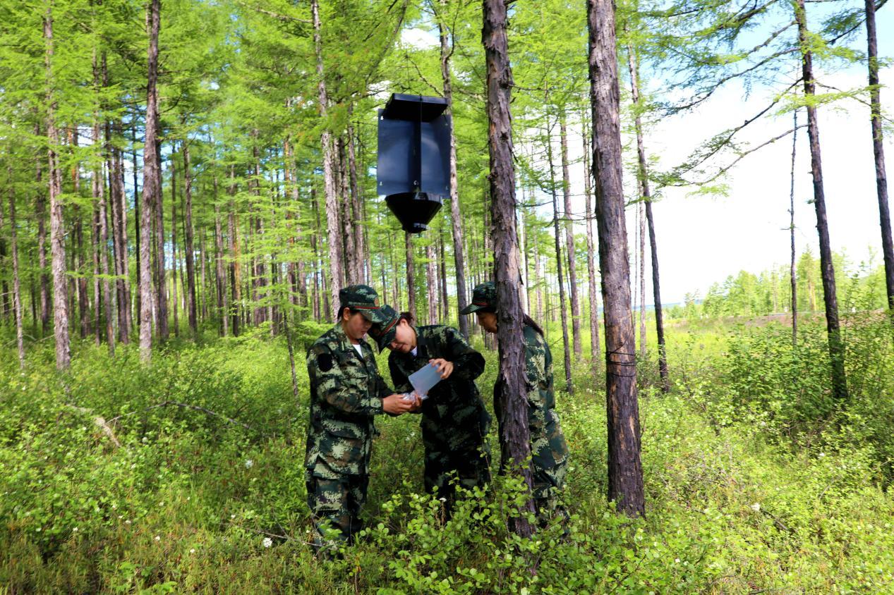 阿木爾林業(yè)局林防站工作人員在監(jiān)測(cè)樣地收集小蠹蟲(王力 攝)